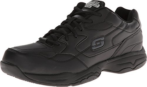 Supportive work shoe showcasing lace-up vamp, logos on tongue/aspect, and bolstered stitching